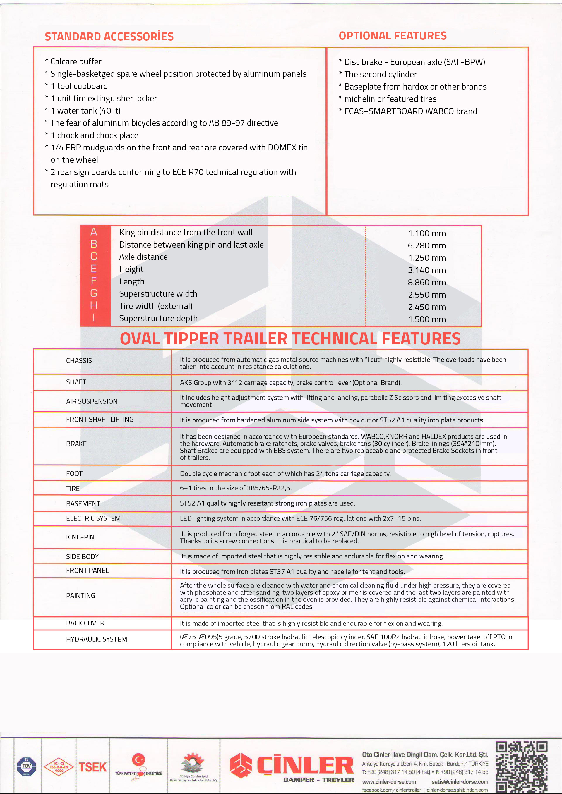 BRAKE: İt has been designed in accordance with European standards. WABCO,KNORR and HALDEX products are used in the hardware. Automatic brake ratchets, brake valves, brake fans (30 cylinder), Brake linings (394*210 mm). Shaft Brakes are equipped with EBS system. There are two replaceable and protected Brake Sockets in front of trailers.